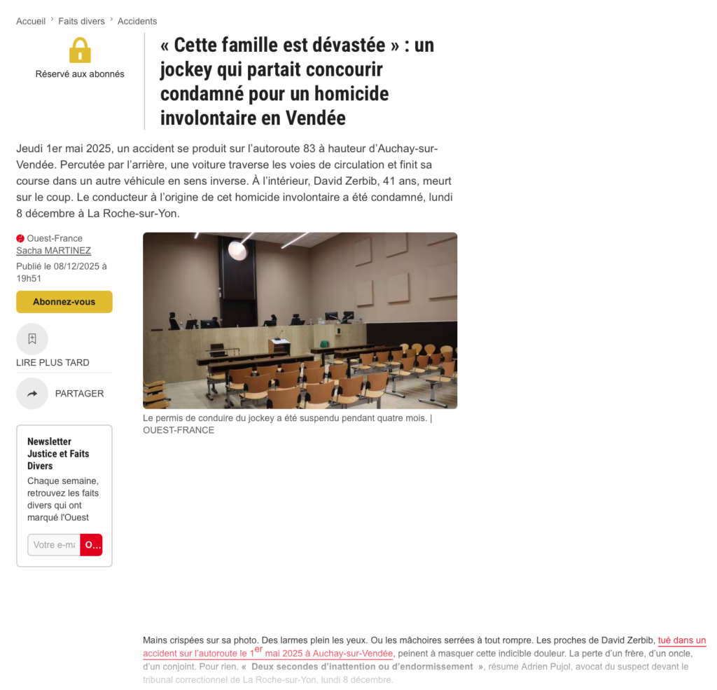 Ouest – France : défense d’un jockey professionnel après un homicide involontaire routier